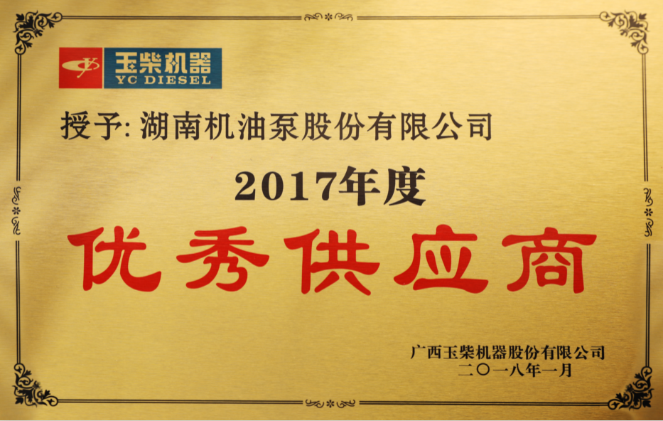 喜訊!我公司被玉柴機器評為2017年度優(yōu)秀供應商、玉柴國六戰(zhàn)略供應商!